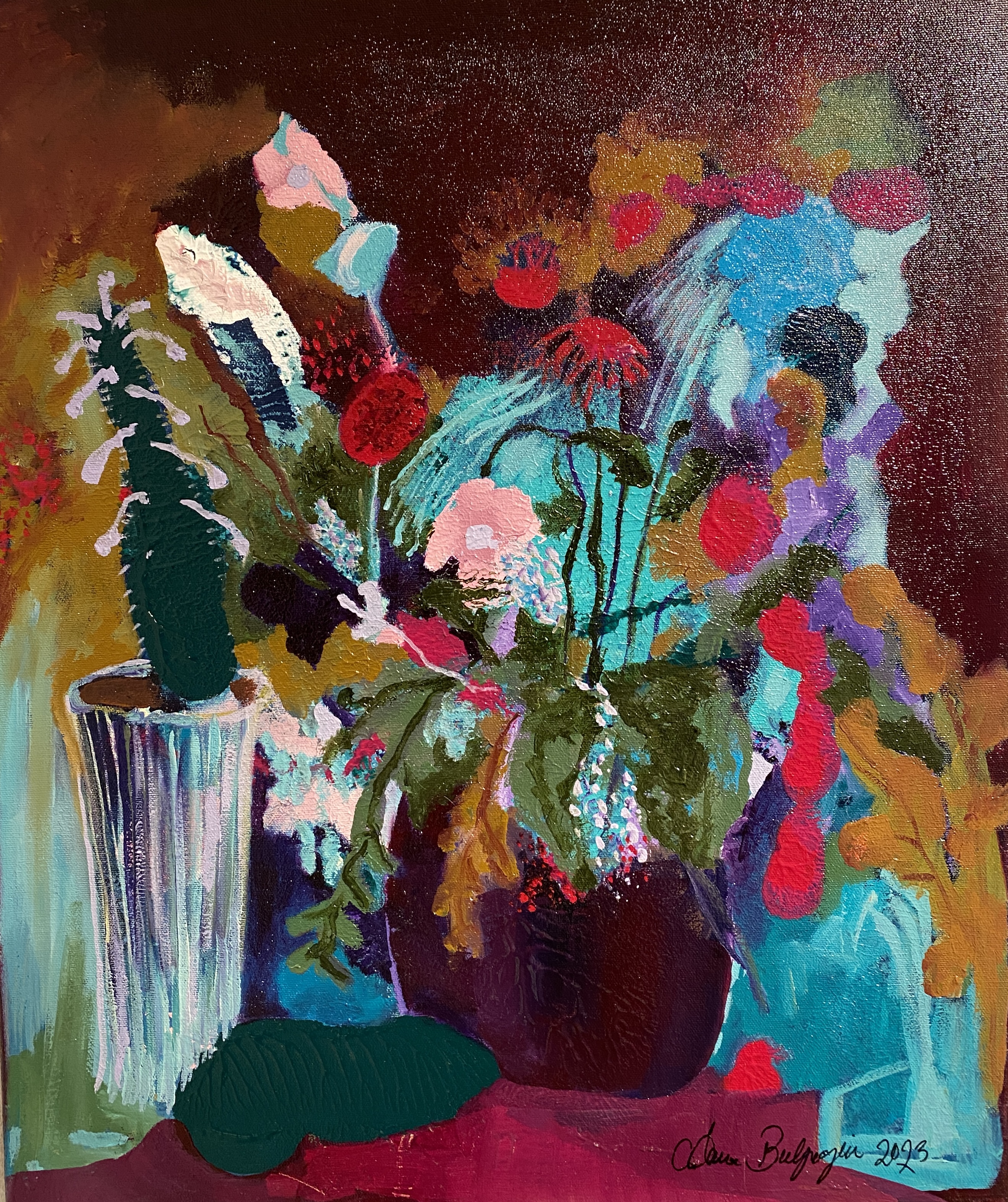 Jatkot salaisessa puutarhassa. 100x100cm, öljyväri kankaalle, 2024. 750,-